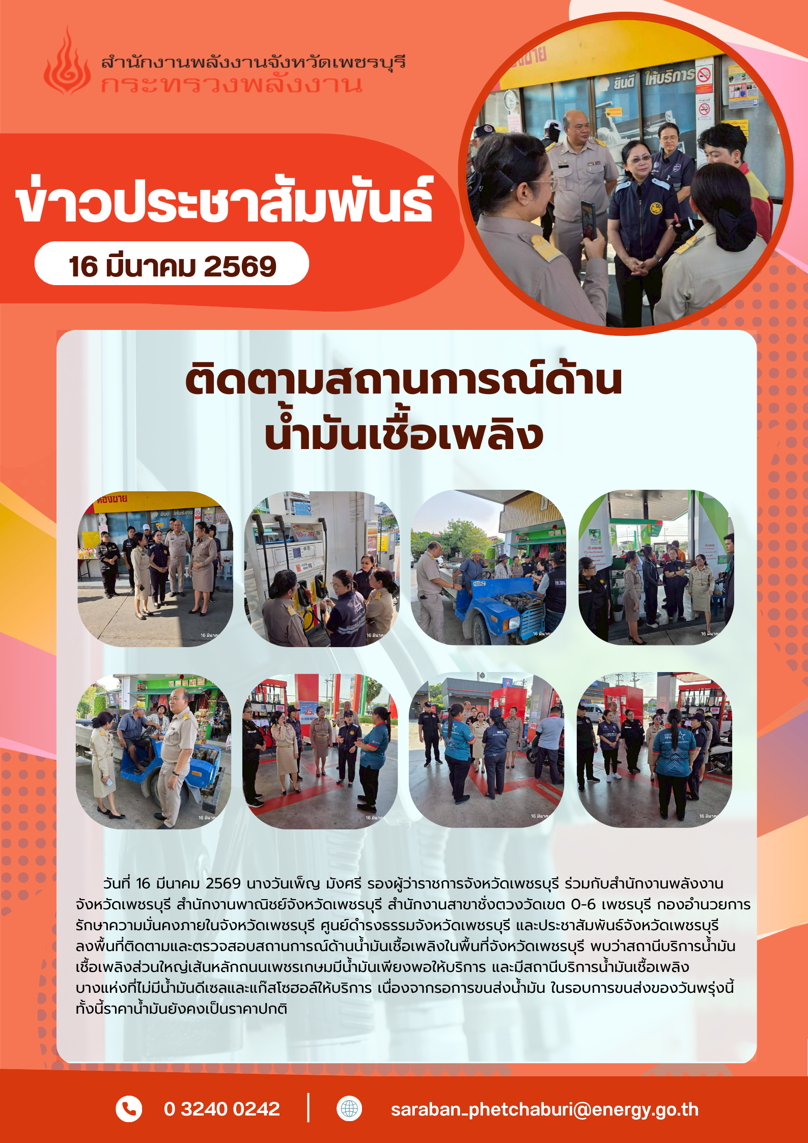 วันที่ 16 มีนาคม 2569 นางวันเพ็ญ มังศรี รองผู้ว่าราชการจังหวัดเพชรบุรี ร่วมกับสำนักงานพลังงานจังหวัดเพชรบุรี สำนักงานพาณิชย์จังหวัดเพชรบุรี สำนักงานสาขาชั่งตวงวัดเขต 0-6 เพชรบุรี กองอำนวยการรักษาความมั่นคงภายในจังหวัดเพชรบุรี ศูนย์ดำรงธรรมจังหวัดเพชรบุรี และประชาสัมพันธ์จังหวัดเพชรบุรี ลงพื้นที่ติดตามและตรวจสอบสถานการณ์ด้านน้ำมันเชื้อเพลิงในพื้นที่จังหวัดเพชรบุรี พบว่าสถานีบริการน้ำมันเชื้อเพลิงส่วนใหญ่เส้นหลักถนนเพชรเกษมมีน้ำมันเพียงพอให้บริการ และมีสถานีบริการน้ำมันเชื้อเพลิงบางแห่งที่ไม่มีน้ำมันดีเซลและแก๊สโซฮอล์ให้บริการ เนื่องจากรอการขนส่งน้ำมัน ในรอบการขนส่งของวันพรุ่งนี้ ทั้งนี้ราคาน้ำมันยังคงเป็นราคาปกติ